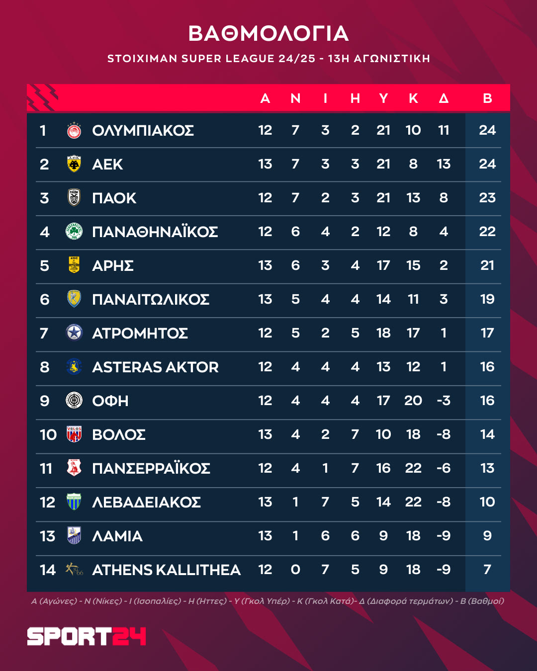 Δείτε πώς έχει διαμορφωθεί η βαθμολογία της Stoiximan Super League μετά τη νίκη της ΑΕΚ με 4-0 επί του Άρη για τη 13η αγωνιστική.