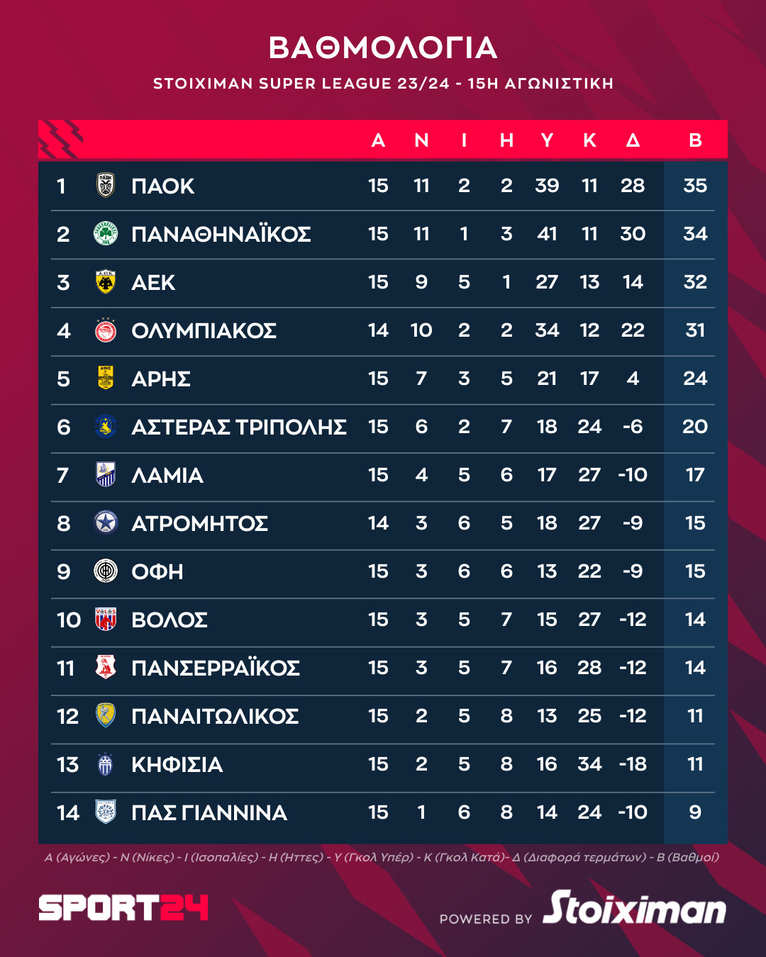 Stoiximan Super League: Η βαθμολογία μετά την εξάρα του ΠΑΟΚ επί της Κηφισιάς