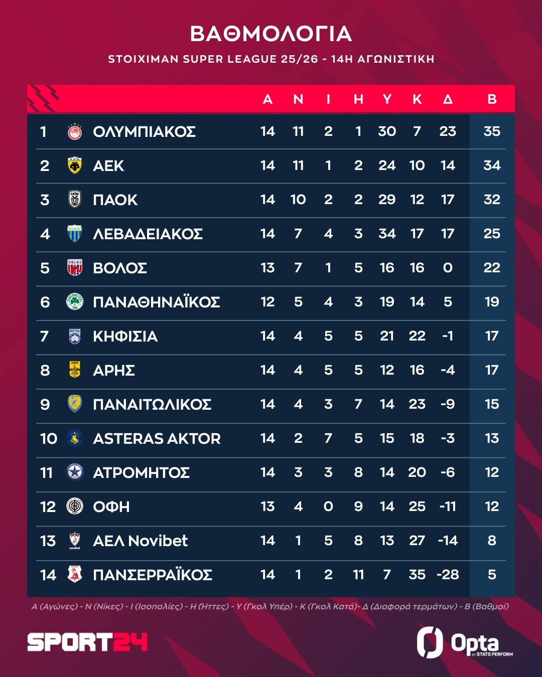 Το πρόγραμμα και τα αποτελέσματα της 14ης αγωνιστικής