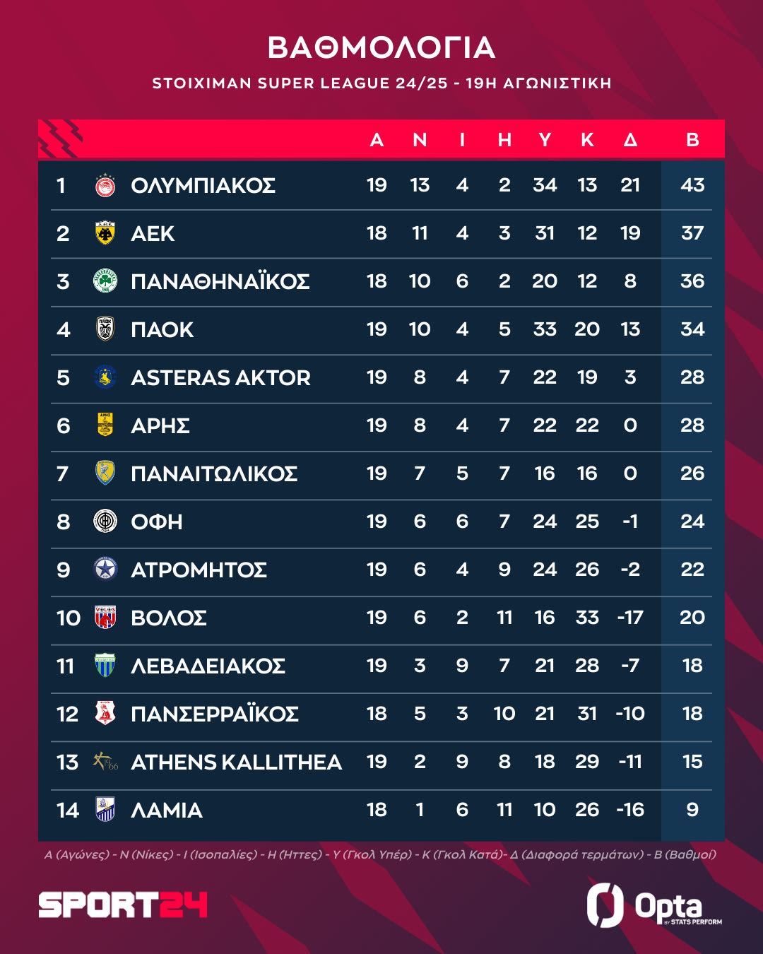 Το πρόγραμμα και τα αποτελέσματα της 19ης αγωνιστικής