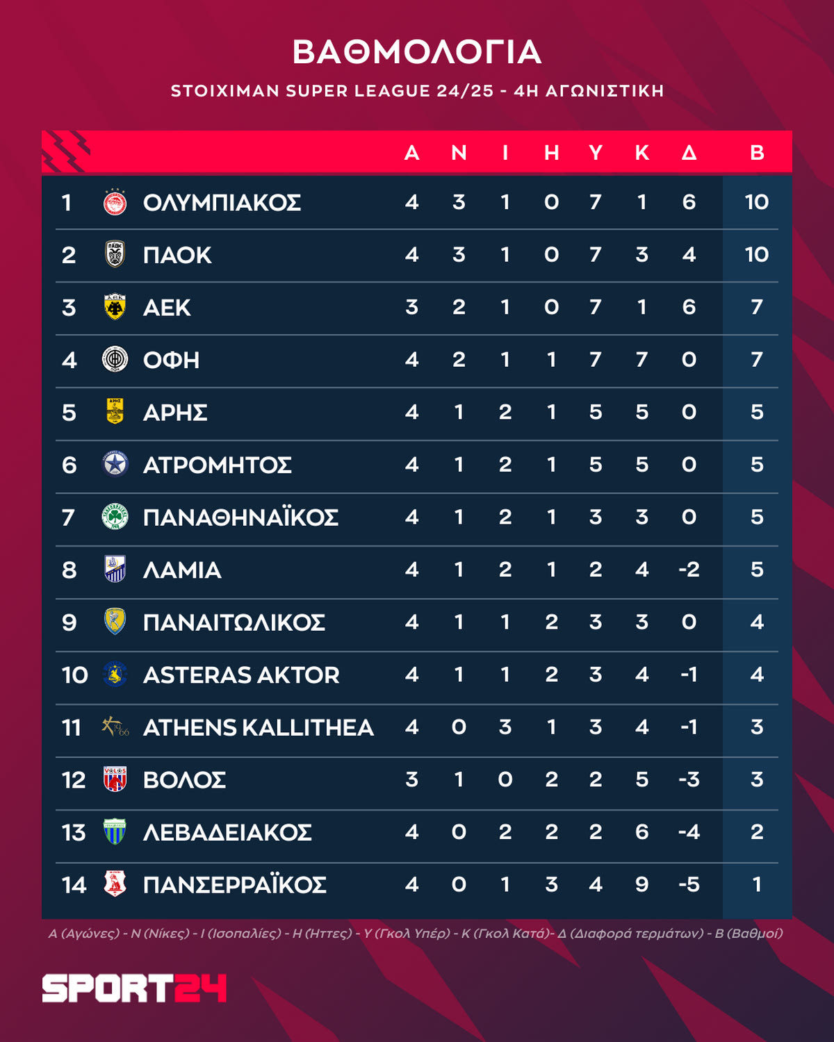 Δείτε πώς διαμορφώθηκε η βαθμολογία μετά από την ισοπαλία στην Τούμπα μεταξύ του ΠΑΟΚ και του Παναθηναϊκού, για την 4η αγωνιστική της Stoiximan Super League.