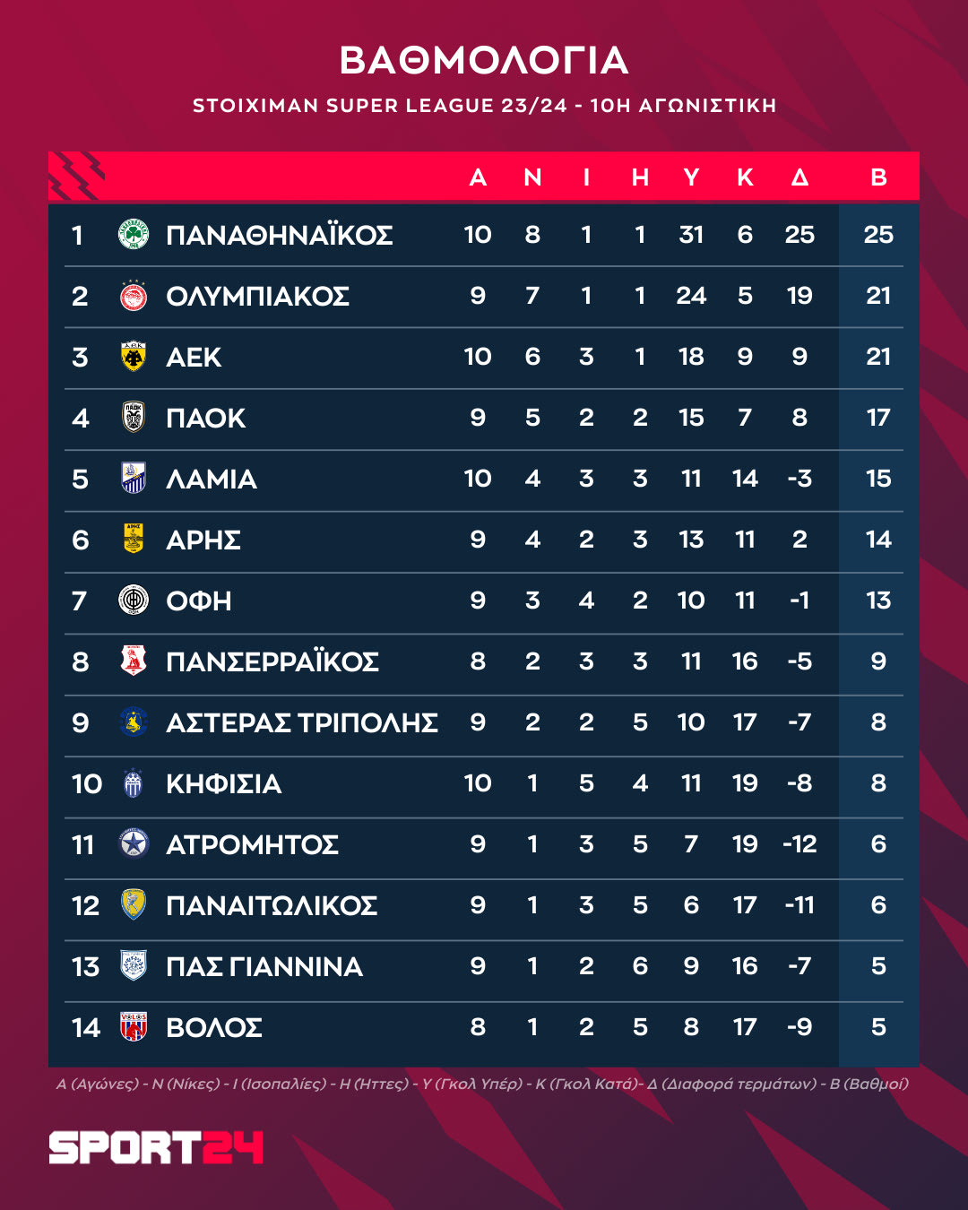 *Ο Παναθηναϊκός έχει πάρει τρεις βαθμούς από το ντέρμπι με τον Ολυμπιακό μετά την απόφαση του πρωτοβάθμιου οργάνου της Super League, ενώ στους ερυθρόλευκους έχει επιβληθεί και -1. Βρισκόμαστε εν αναμονή της απόφασης από την επιτροπή Εφέσεων της ΕΠΟ.