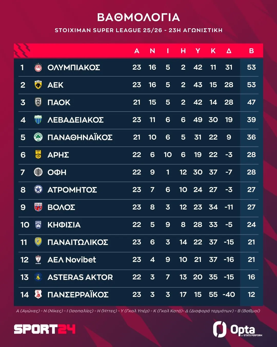 Διαβάστε πώς έχει διαμορφωθεί η βαθμολογία στη Stoiximan Super League μετά την ισοπαλία της ΑΕΚ στο ματς με τον Βόλο για την 23η αγωνιστική.
