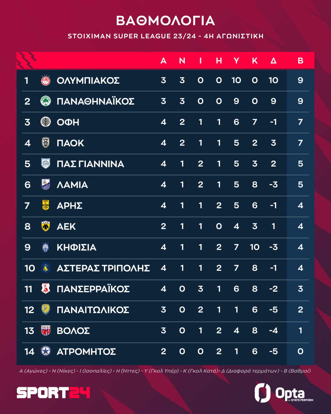 Το Σάββατο, ο Παναθηναϊκός επικράτησε με το εμφατικό 5-0 εκτός έδρας του Παναιτωλικού ενώ από έναν βαθμό πήραν Λαμία και ΟΦΗ μετά το μεταξύ τους 2-2 στο “Αθανάσιος Διάκος”, στο πρώτο χρονικά ματς της 4ης αγωνιστικής.