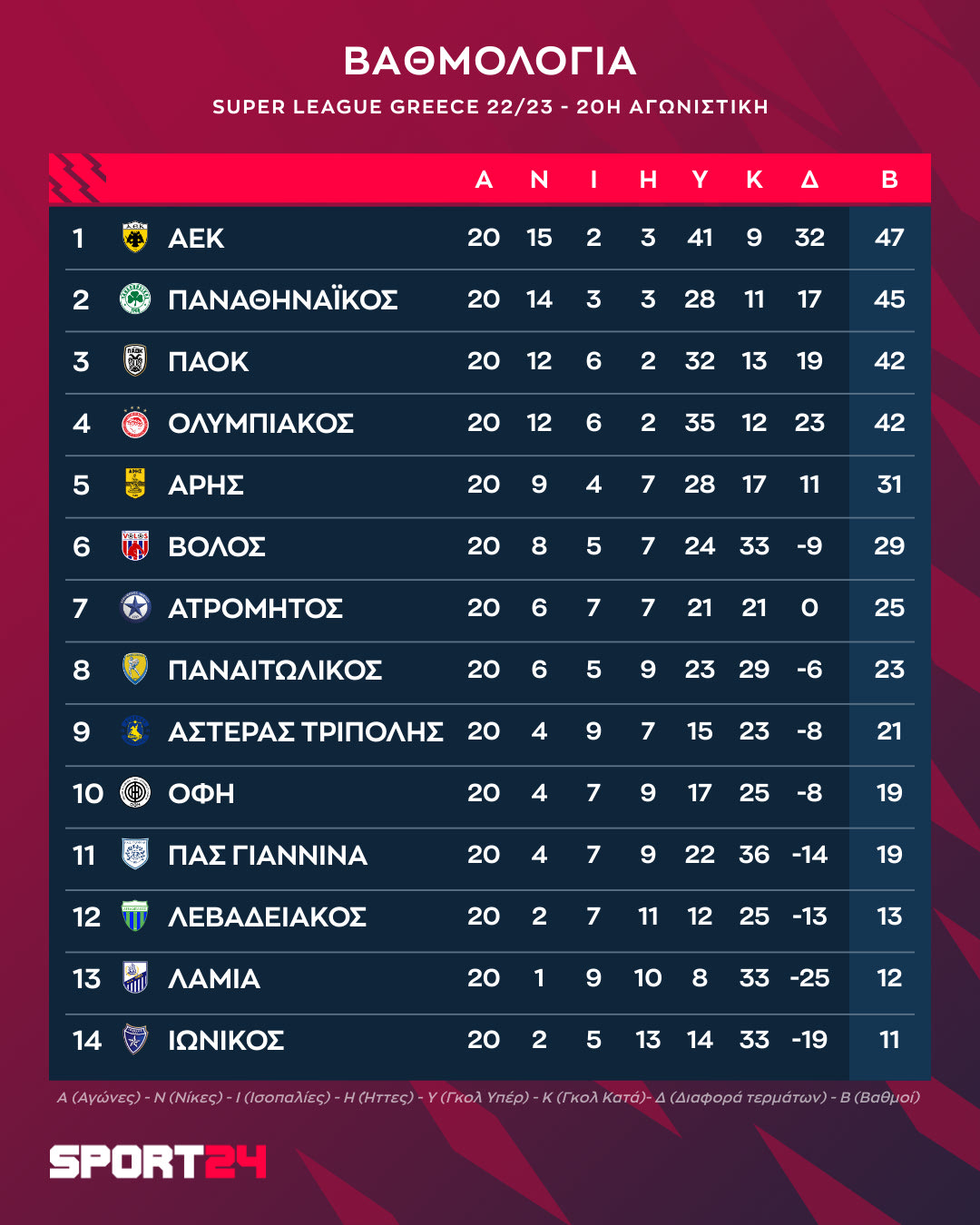 Η βαθμολογία μετά την 20η αγωνιστική της Super League