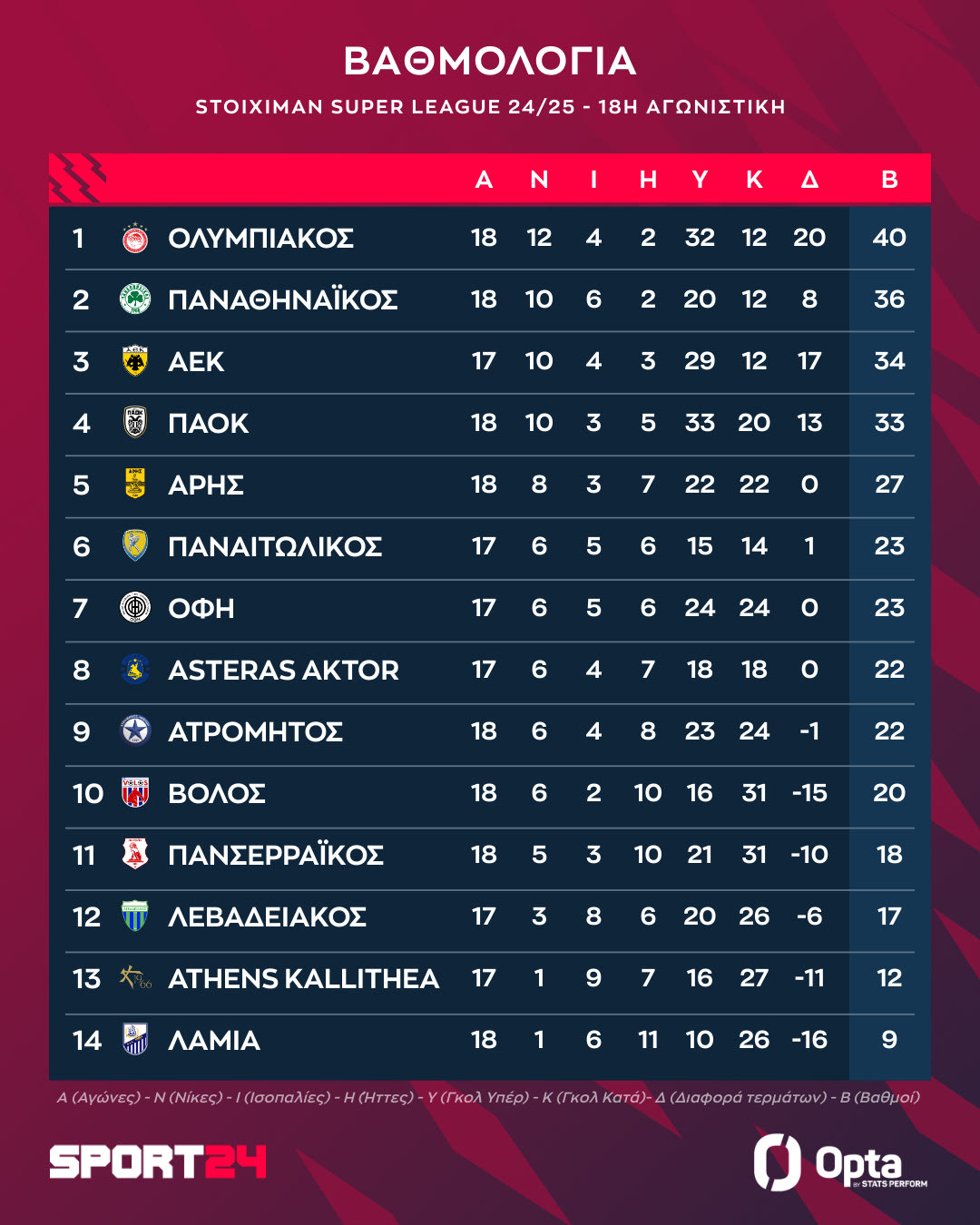 Δείτε πώς έχει διαμορφωθεί η βαθμολογία της Stoiximan Super League μετά το διπλό του Βόλου με ανατροπή στην Τούμπα κόντρα στον ΠΑΟΚ για τη 18η αγωνιστική.