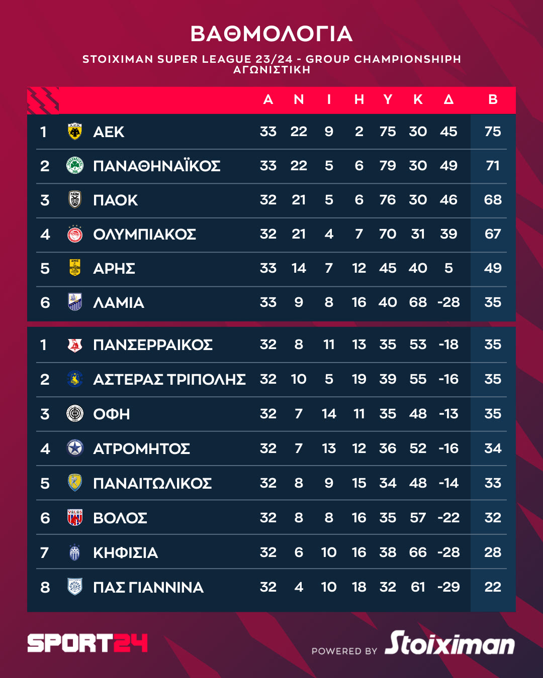 Stoiximan Super League: Η βαθμολογία μετά την ολοκλήρωση της έκτης αγωνιστικής των playouts