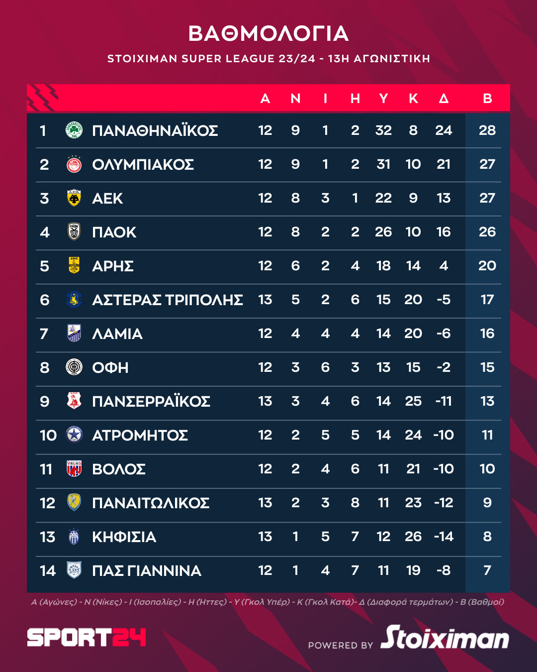 Το πρόγραμμα και τα αποτελέσματα της 13ης αγωνιστικής
