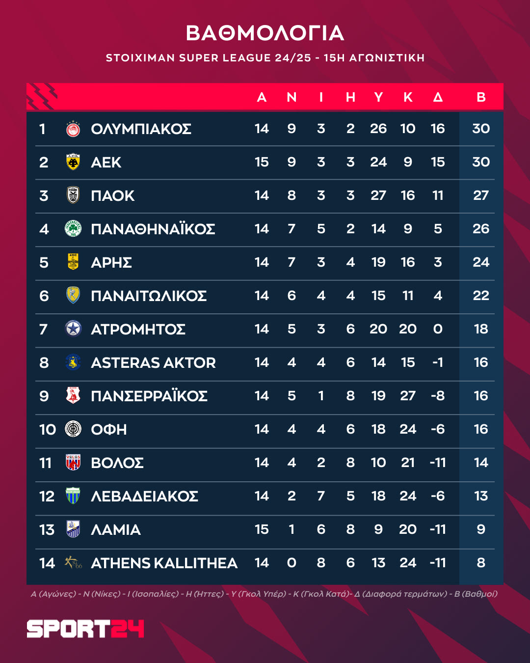 Δείτε πώς έχει διαμορφωθεί η βαθμολογία της Stoiximan Super League μετά το διπλό της ΑΕΚ κόντρα στη Λαμία για τη 15η αγωνιστική.