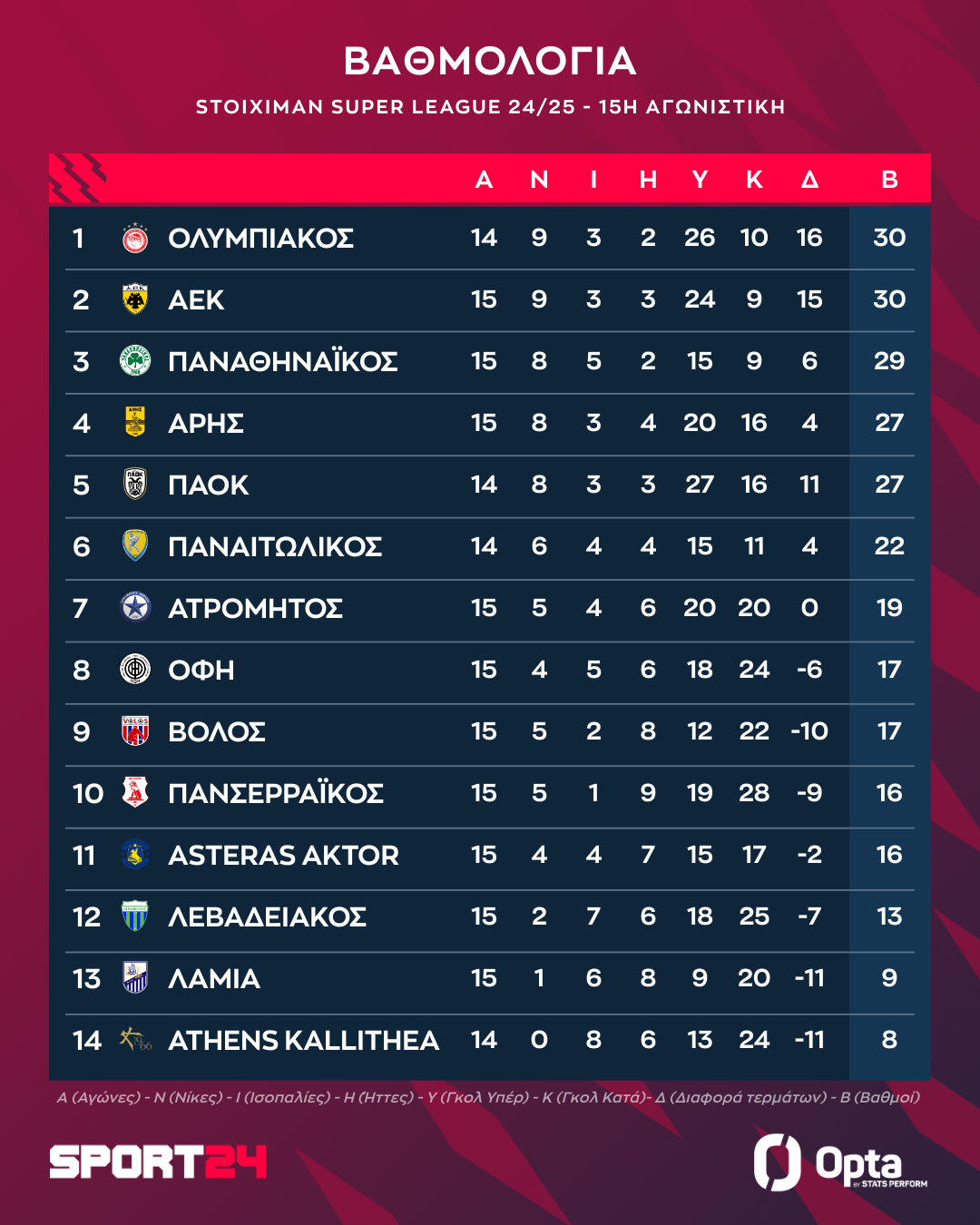 Το πρόγραμμα και τα αποτελέσματα της 15ης αγωνιστικής