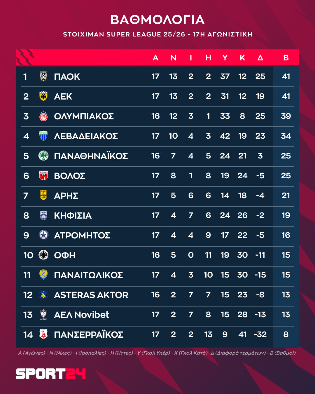 Stoiximan Super League: Η βαθμολογία μετά το σπουδαίο διπλό του Ατρόμητου στον Βόλο και την ολοκλήρωση της 17ης αγωνιστικής