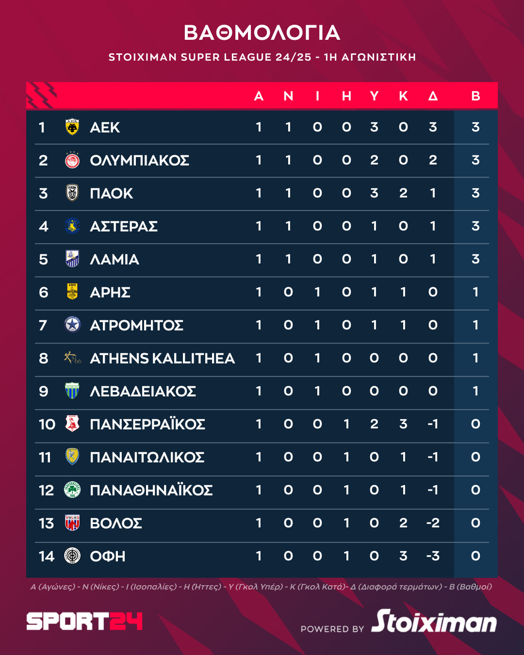 Stoiximan Super League: Η βαθμολογία μετά το τέλος της πρώτης αγωνιστικής