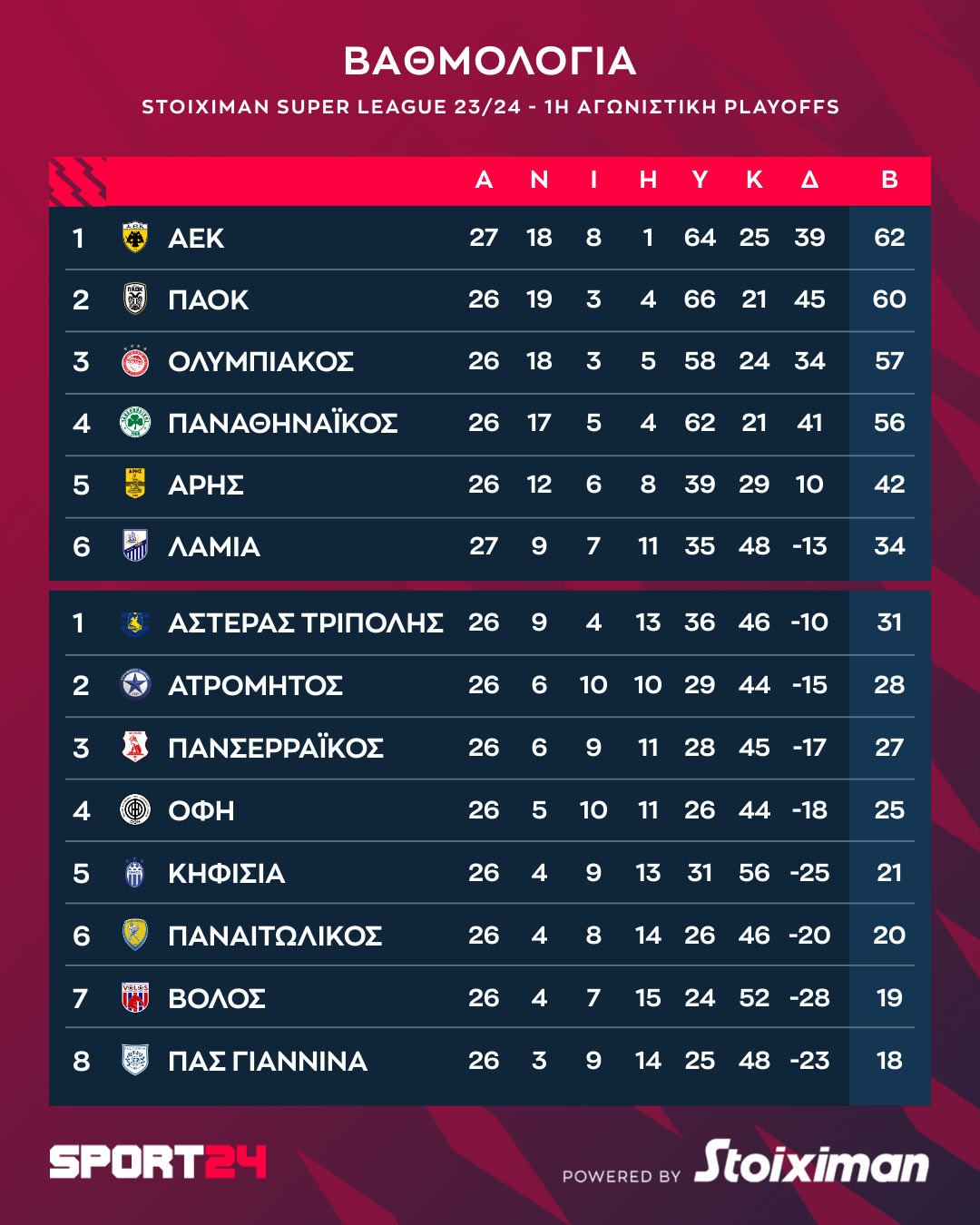 Stoiximan Super League: Η βαθμολογία των playoffs μετά τη νίκη της ΑΕΚ στη Λαμία