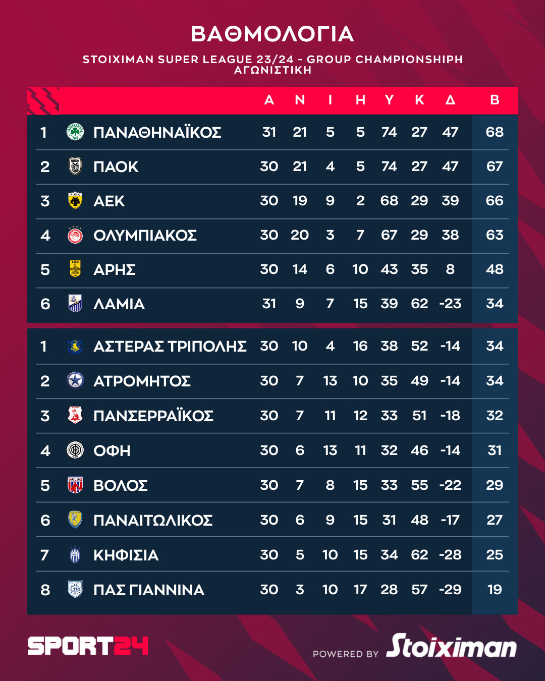 Stoiximan Super League: Η βαθμολογία των playoffs μετά τη νίκη του Παναθηναϊκού επί της Λαμίας