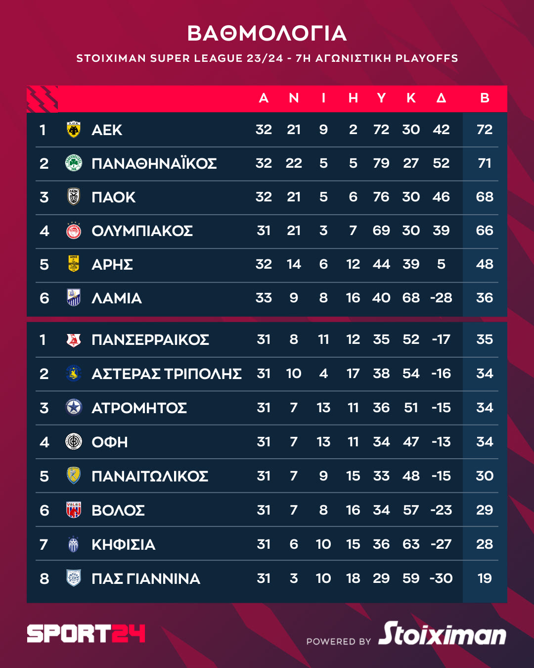 Stoiximan Super League: Η βαθμολογία των playoffs μετά την ισοπαλία του ΠΑΟΚ στη Λαμία