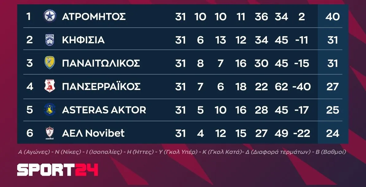 Κηφισιά και Παναιτωλικός πήραν από ένα βαθμό και έκαναν ένα ακόμη βήμα παραμονής, ενώ η νίκη του Ατρόμητου με 2-1 επί του Αστέρα AKTOR έριξε κάτω από την επικίνδυνη ζώνη την ομάδα της Τρίπολης.