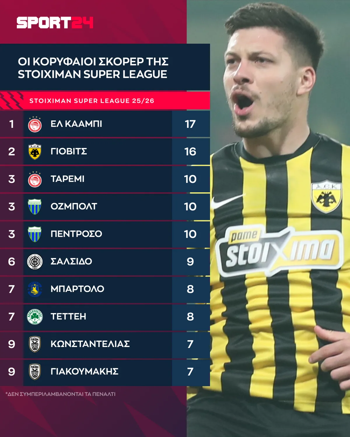 Ο Λούκα Γιόβιτς άνοιξε τον δρόμο της νίκης της ΑΕΚ, έφτασε τα 16 γκολ και πλέον ο Αγιούμπ Ελ Κααμπί, που δεν σκόραρε με τον Ολυμπιακό, νιώθει την “καυτή” του ανάσα. Δείτε τους πρώτους σκόρερ με την ολοκλήρωση της κανονικής διάρκειας της Stoiximan Super League.