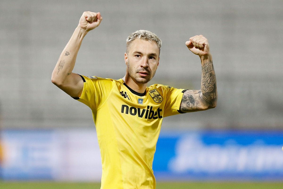Ο Λορέν Μορόν πανηγυρίζει γκολ του στο Βόλος - Άρης