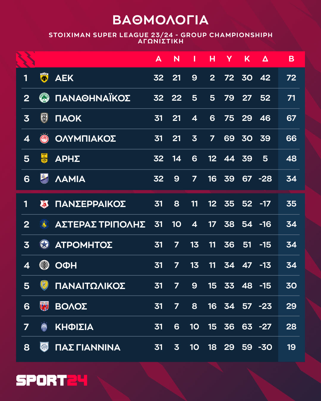 ΟΦΗ: Όπως κι ο Ατρόμητος, έτσι κι αυτός θέλει τουλάχιστον έναν βαθμό στα παιχνίδια που του απομένουν με Αστέρα Τρίπολης (εκτός) και Παναιτωλικό (εντός). Πάντα υπό την προϋπόθεση πως οι τρεις ομάδες που βρίσκονται από κάτω του (Παναιτωλικός, Βόλος, Κηφισιά) κάνουν το 2/2 και ανεβάζουν τον πήχη της σωτηρίας στους 34 βαθμούς.