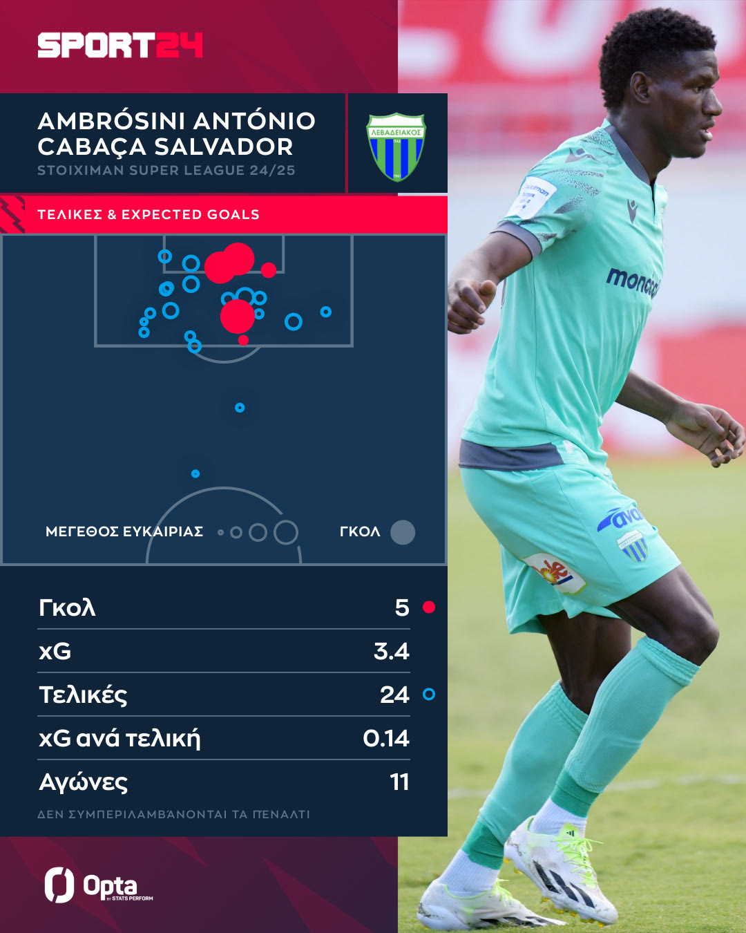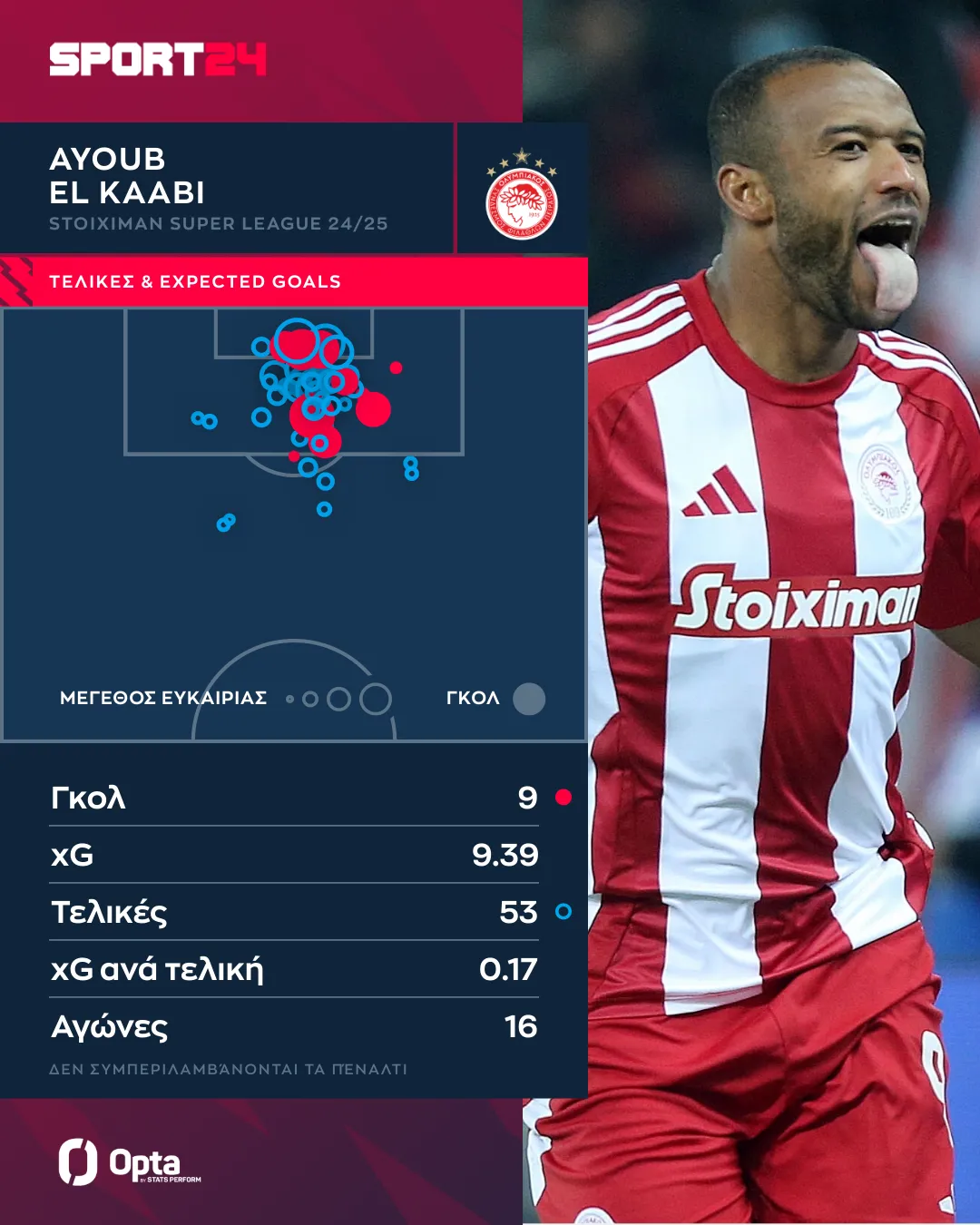 Παράλληλα εκτελεί 3.4 φορές ανά ματς και οι 1.8 είναι εντός στόχου (όντας πρώτος στη σχετική κατηγορία). Τα xGoals του υπερβαίνουν τα γκολ που πέτυχε καθώς ο Ελ Κααμπί έχει χάσει 17 μεγάλες ευκαιρίες στο πρωτάθλημα. Η μεγάλη ευκαιρία είναι τουλάχιστον 0.1 xGoals.