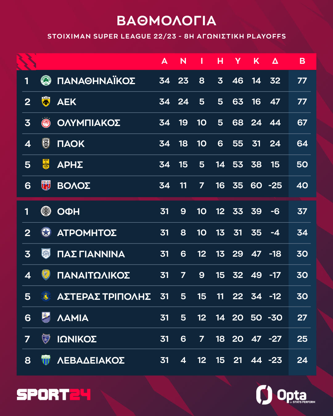 Βέβαια, αυτή η παραμονή μπορεί να εξασφαλιστεί ακόμη και με ήττα κόντρα στον ΠΑΣ Γιάννινα, αρκεί να μην κερδίσουν Λεβαδειακός και Ιωνικός στην επόμενη αγωνιστική.