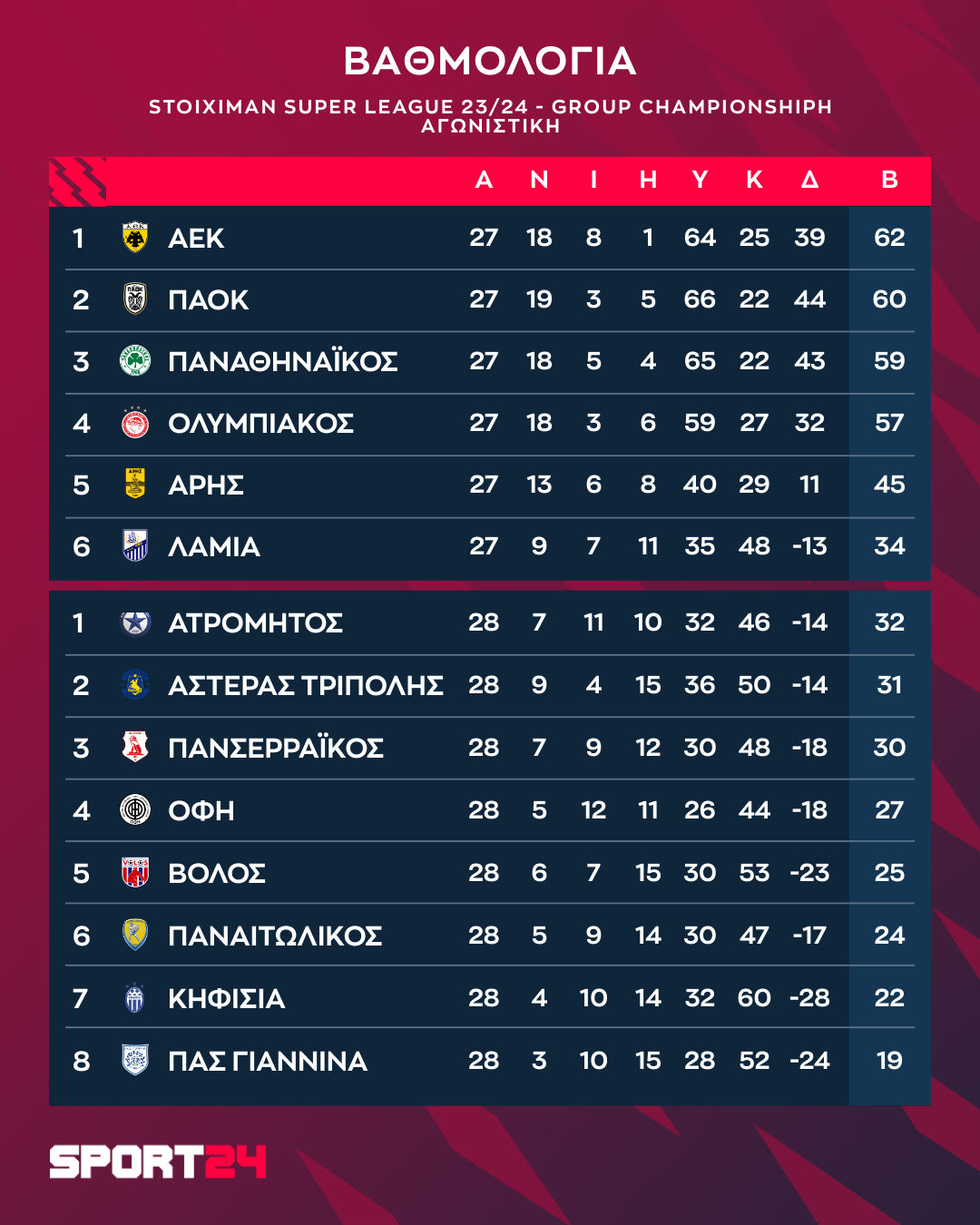 Οι δύο τελευταίες ομάδες της βαθμολογίας που βρίσκονται σε πιο δύσκολη θέση έχουν δύσκολες εκτός έδρας αποστολες, με τον ουραγό ΠΑΣ Γιάννινα να αντιμετωπίζει στο “Γεντί Κουλέ” τον ΟΦΗ και την προτελευταία Κηφισιά να παίζει στην Τρίπολη με τον τοπικό Αστέρα.