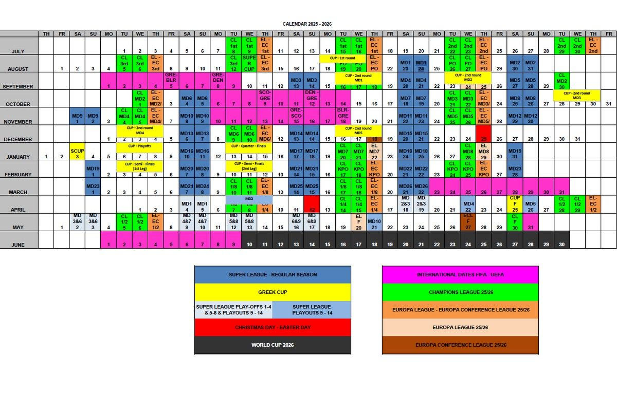 Η Super League δημοσίευσε το μεσημέρι της Δευτέρας (14/07) το αναλυτικό καλεντάρι μέχρι και το φινάλε της σεζόν 2025/26.