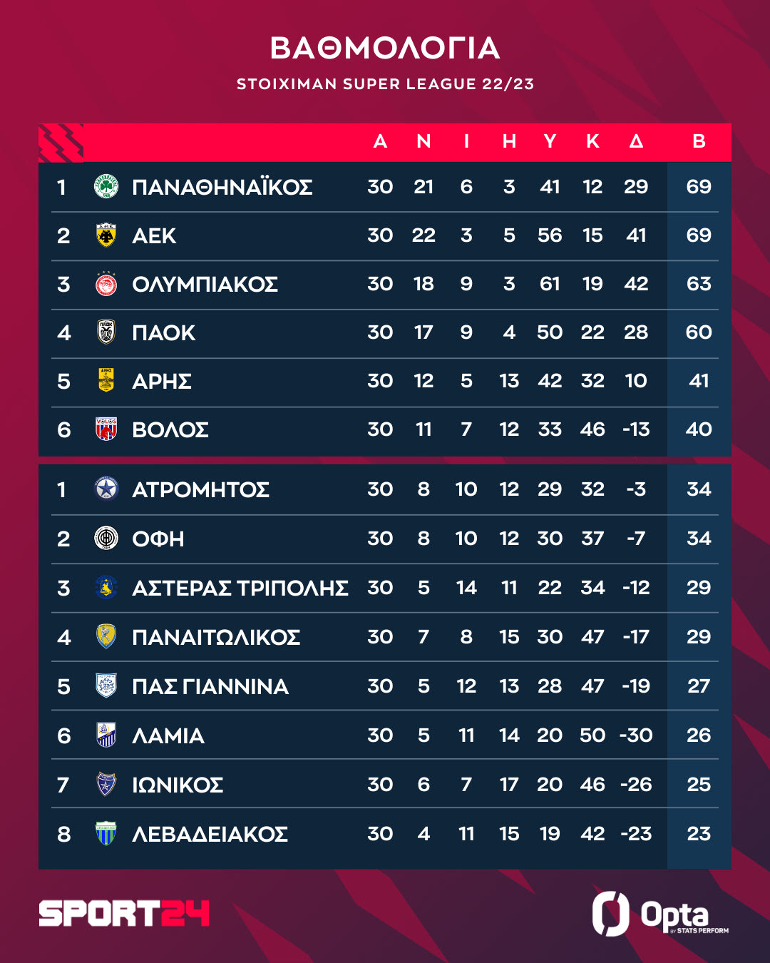 Πάνω από τη ζώνη του υποβιβασμού είναι η Λαμία με 26 βαθμούς και ο ΠΑΣ Γιάννινα με 27. Πιο πάνω στους 29 πόντους βρίσκονται οι Παναιτωλικός και Αστέρας. Οι δύο ομάδες δεν έχουν “καθαρίσει”, αλλά μπορούν να το κάνουν την επόμενη αγωνιστική.