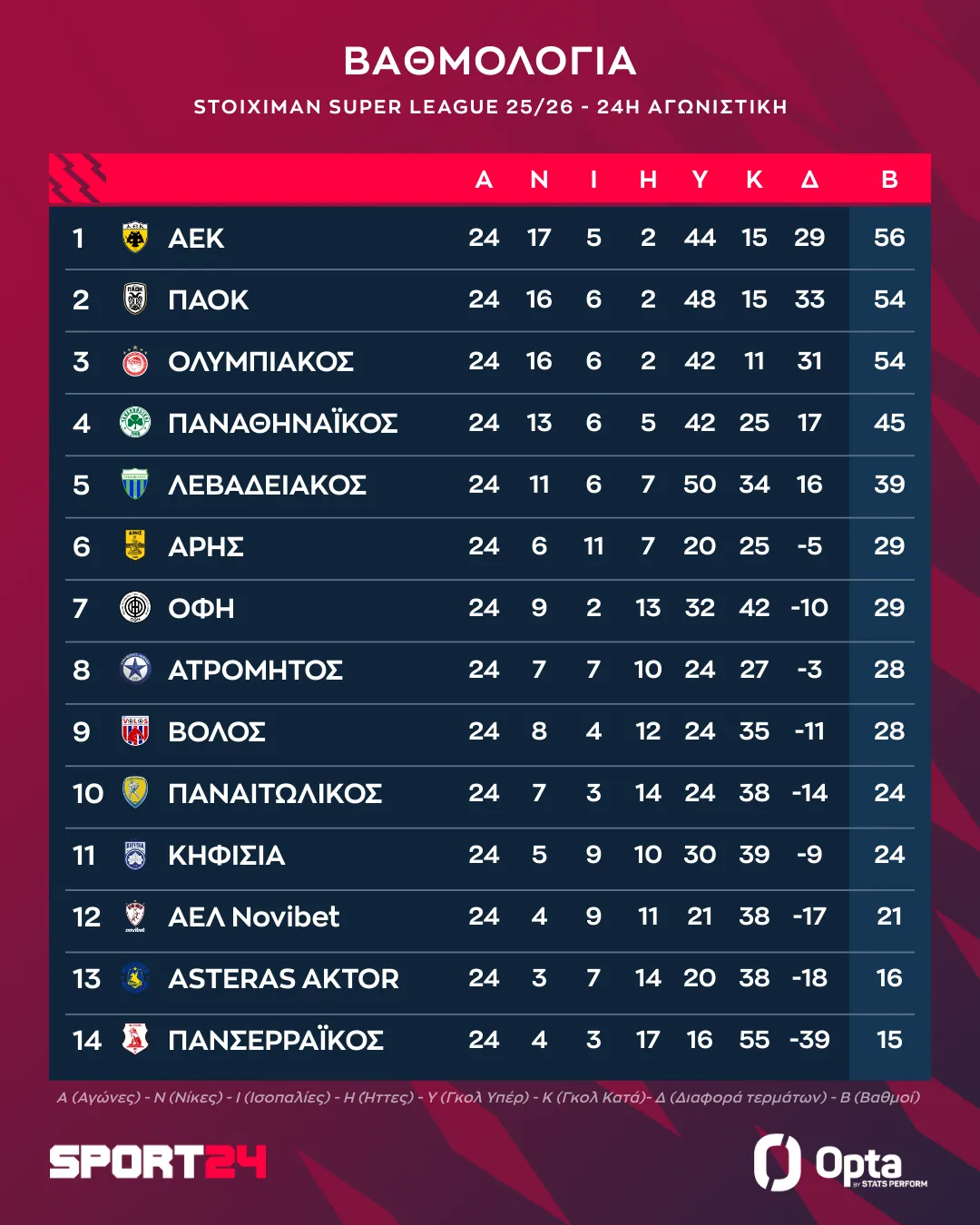 Η 24η αγωνιστική της Stoiximan Super League ολοκληρώθηκε το βράδυ της Δευτέρας στο Αγρίνιο, με τον Παναιτωλικό να γιορτάζει με τον καλύτερο δυνατό τρόπο τη συμπλήρωση 100 χρόνων ζωής καθώς επιβλήθηκε με 2-1 της Κηφισιάς με ανατροπή και την έπιασε στη 10η θέση της βαθμολογίας, αυξάνοντας παράλληλα στους οκτώ πόντους την απόστασή του από τη γραμμή του υποβιβασμού.