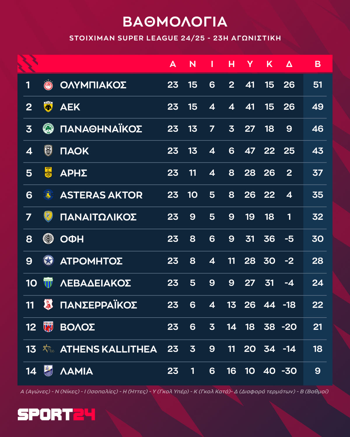 - 24η αγωνιστική: 23/02 19:30 Αστέρας Τρίπολης AKTOR – ΑΕΚ
