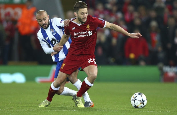 Porto's Andre Andre, left, fights for the ball with Liverpool's Adam Lallana during the Champions League round of 16, second leg, soccer match between Liverpool and FC Porto at Anfield Stadium, Liverpool, England, Tuesday March 6, 2018. (AP Photo/Dave Thompson) AP Photo/Dave Thompson