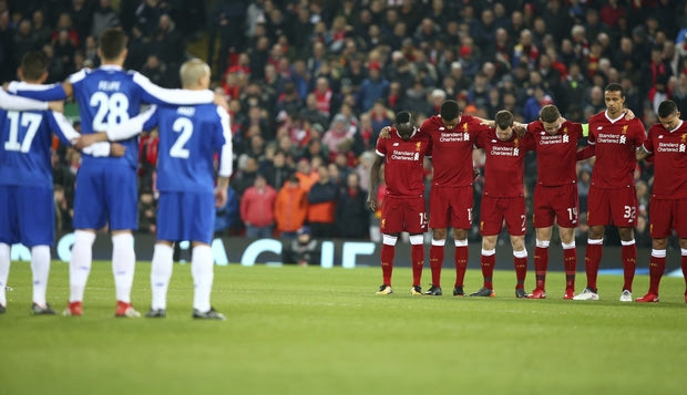 Porto, left, and Liverpool players stand, during a minute of silence for Fiorentina player Davide Astori who died Sunday, before the Champions League round of 16, second leg, soccer match between Liverpool and FC Porto at Anfield Stadium, Liverpool, England, Tuesday March 6, 2018. (AP Photo/Dave Thompson) AP Photo/Dave Thompson