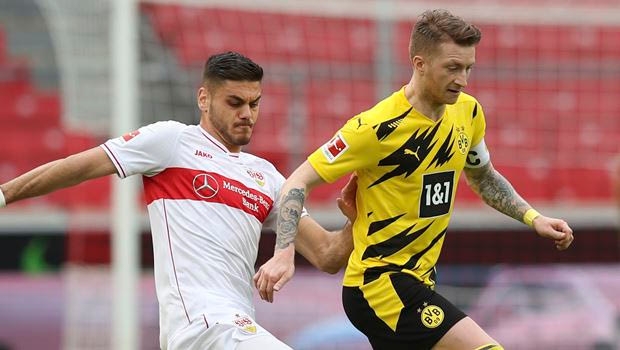 Ο Μάρκο Ρόις της Ντόρτμουντ μονομαχεί με τον Ντίνο Μαυροπάνο της Στουτγκάρδης για την Bundesliga 2020-2021 στη "Μερτσέντες Μπεντς Αρένα", Στουτγκάρδη | Σάββατο 10 Απριλίου 2021 © 2021 Tom Weller/Associated Press