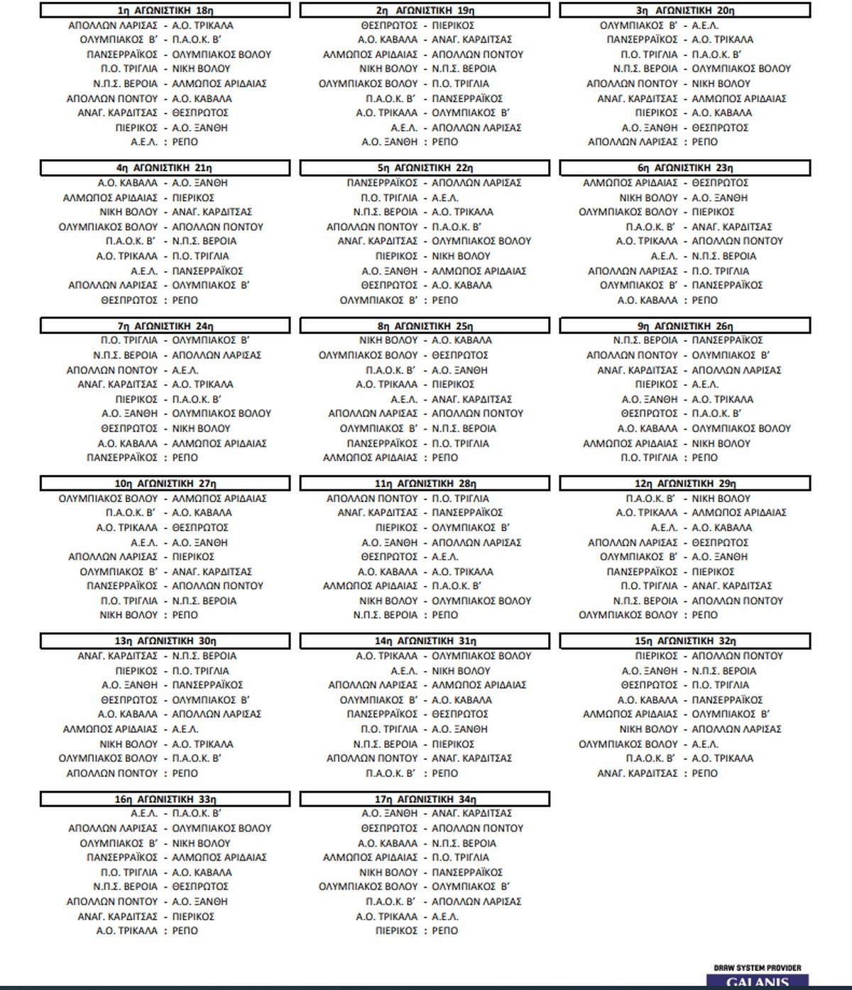 Οι πρώτες έξι αγωνιστικές: ΠΑΟΚ Β’ (06/11 – εντός), Τρίκαλα (14/11 – εκτός), ΑΕΛ (21/11 – εντός), Απόλλων Λάρισας (24/11 – εκτός), ρεπό (28/11), Πανσερραϊκός (05/12 – εντός).