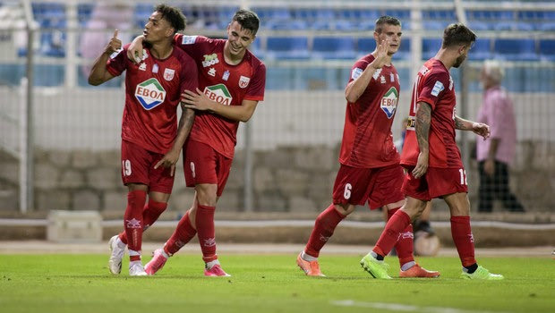 Οι παίκτες του Βόλου πανηγυρίζουν γκολ σε ματς με την Λαμία για την Super League Eurokinissi Sports