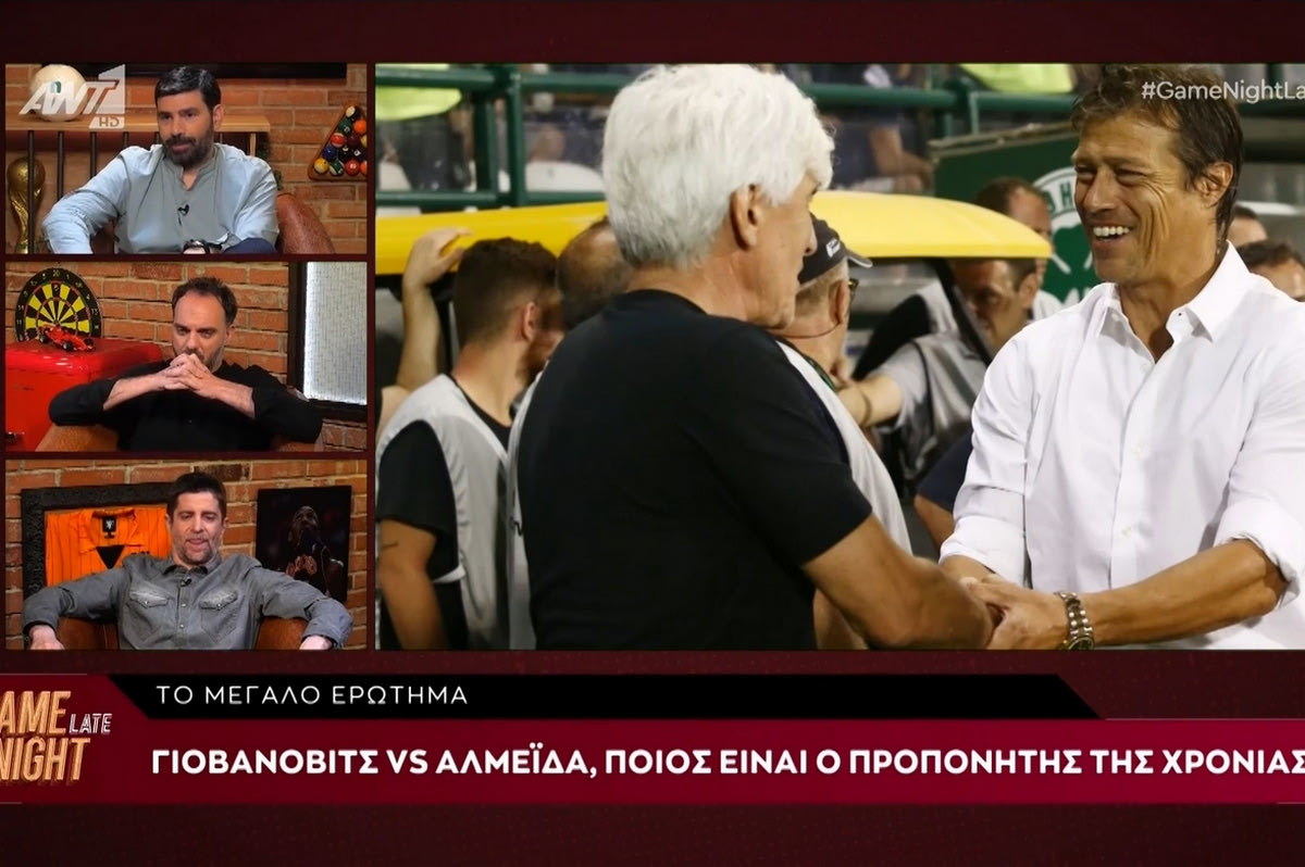 Παντελής Βλαχόπουλος, Θέμης Καίσαρης και Παντελής Διαμαντόπουλος σχολίασαν στην Game Night Late του ΑΝΤ1 ποιος είναι ο καλύτερος προπονητής της χρονιάς, ο Ιβάν Γιοβάνοβιτς ή ο Ματίας Αλμέιδα.