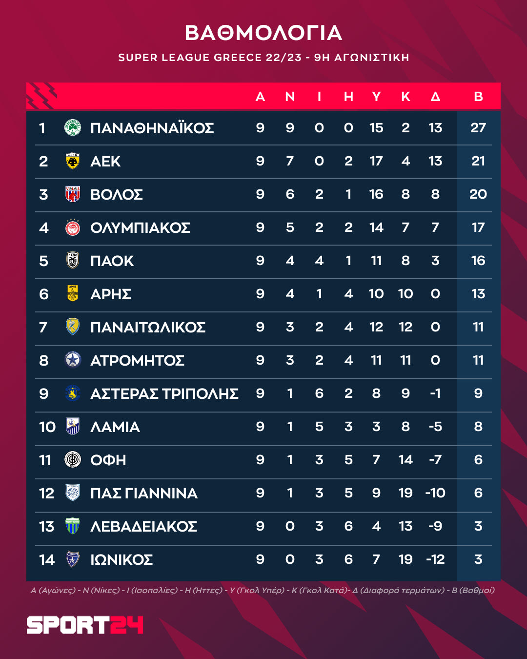 Το πρόγραμμα και τα αποτελέσματα της ένατης αγωνιστικής