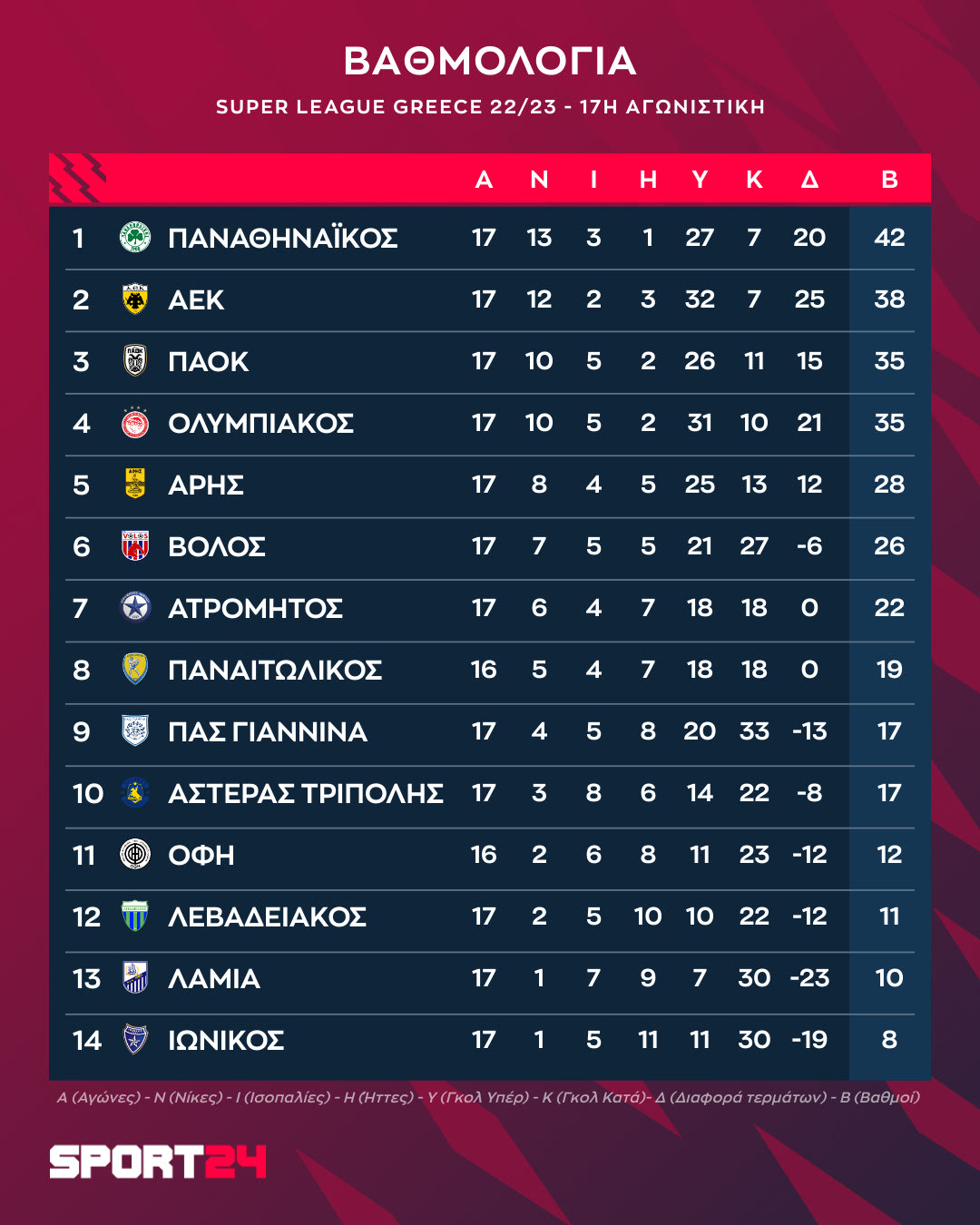 Δείτε πώς διαμορφώθηκε η βαθμολογία μετά τη νίκη της ΑΕΚ επί του Παναθηναϊκού στην OPAP Arena. Η Ένωση μείωσε στους τέσσερις βαθμούς τη διαφορά από το τριφύλλι.