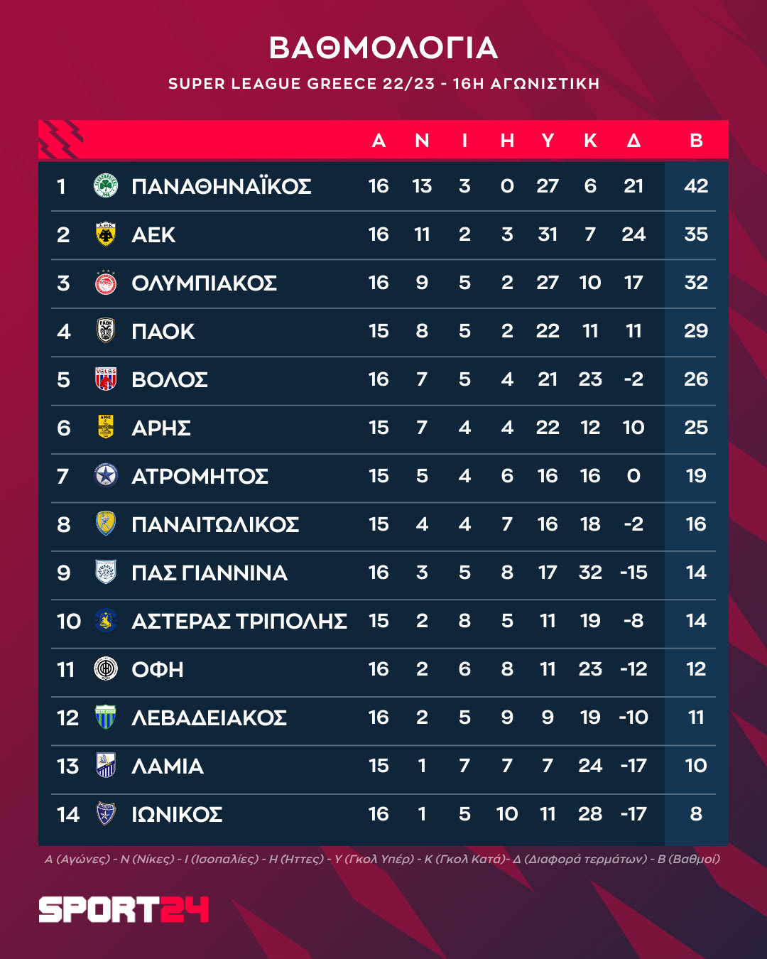 Το πρόγραμμα και τα αποτελέσματα της 16ης αγωνιστικής της Super League