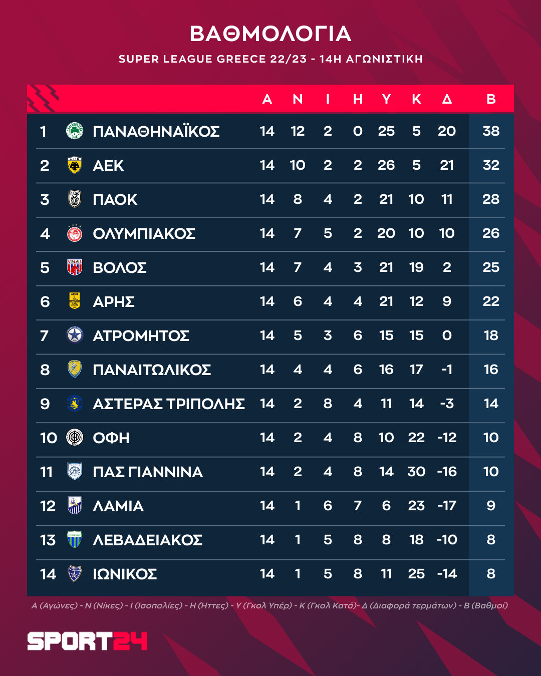 Το πρόγραμμα και τα αποτελέσματα της 14ης αγωνιστικής