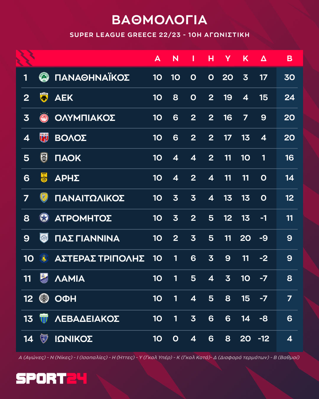 Super League: Η βαθμολογία μετά τη νίκη του ΠΑΣ Γιάννινα και την ολοκλήρωση της 10ης αγωνιστικής