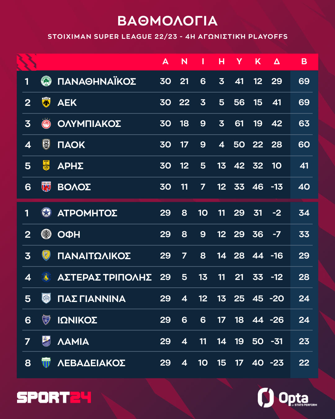 Super League: Η βαθμολογία των playoffs μετά τη νίκη του Παναθηναϊκού στο ντέρμπι της Λεωφόρου