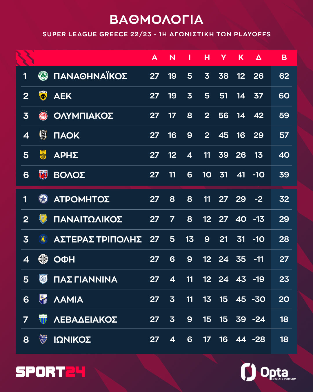 Δείτε πώς διαμορφώθηκε η βαθμολογία των playoffs μετά την ισοπαλία ανάμεσα στην ΑΕΚ και τον Παναθηναϊκό για την πρώτη αγωνιστική.