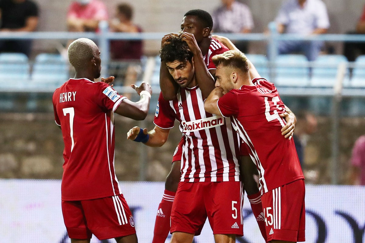 Οι παίκτες του Ολυμπιακού πανηγυρίζουν το γκολ κόντρα στη Λαμία