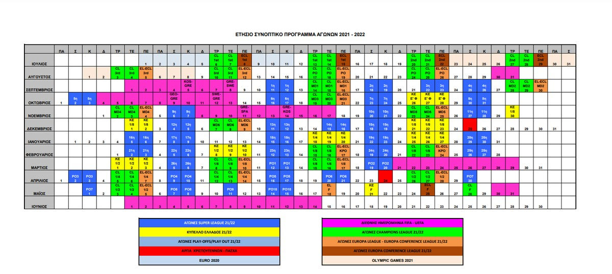 Η Super League Interwetten ανακοίνωσε το καλεντάρι για τη σεζόν 2021/22, με τα playoffs να ξεκινούν 12 Μαρτίου και την αυλαία του πρωταθλήματος να πέφτει στις 15 Μαΐου. Στις 21 του ίδιου μήνα ο τελικός του Κυπέλλου Ελλάδας.