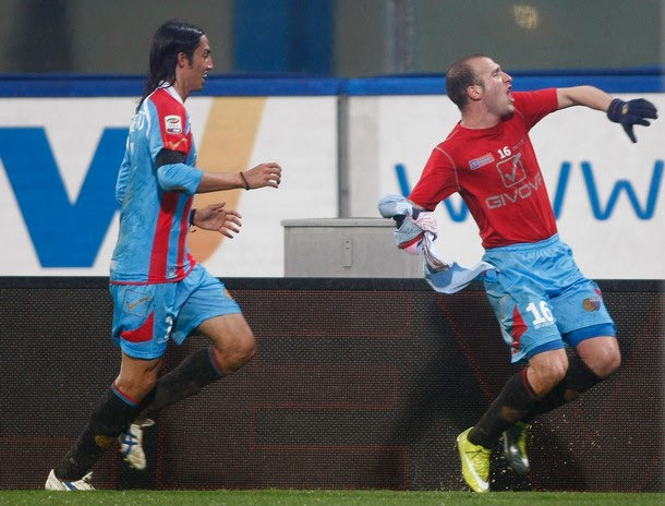 CATANIA, ITALY - MARCH 13: Cristian Llama of Catania celebarets a victory goal during the Serie A match between Catania Calcio and UC Sampdoria at Stadio Angelo Massimino on March 13, 2011 in Catania, Italy. (Photo by Maurizio Lagana/Getty Images)