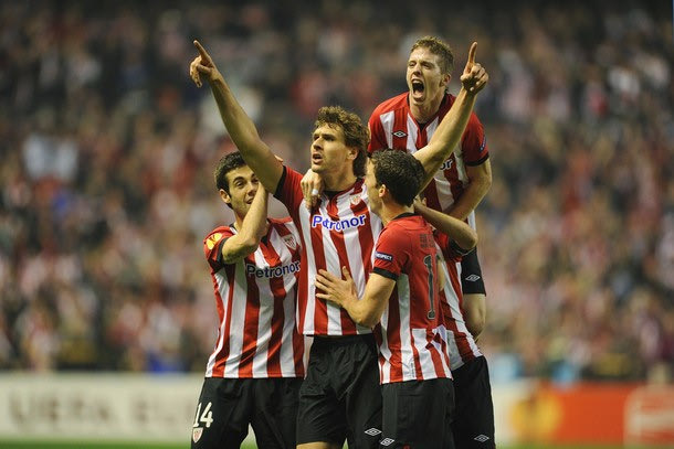 BILBAO, SPAIN - MARCH 15: Fernando Llorente of Bilbao celebrates scoring to make it 1-0 during the UEFA Europa League Round of 16 second leg match between Manchester United and Athletic Bilbao at San Mames Stadium on March 15, 2012 in Bilbao, Spain. (Photo by Michael Regan/Getty Images)