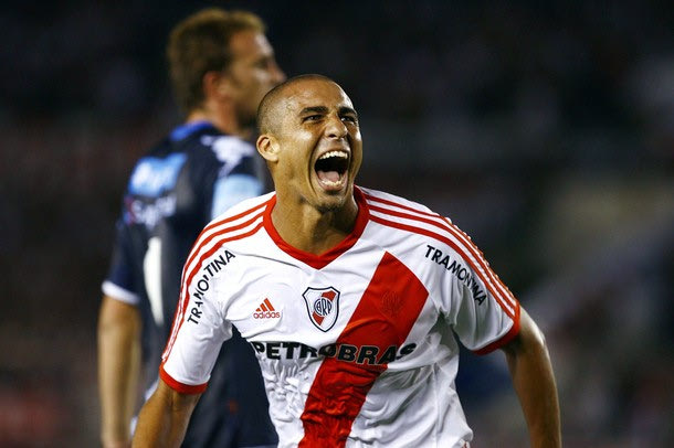 River Plate's new player, French-Argentine David Trezeguet celebrates after scoring the team's third goal against Independiente de Rivadavia, in Buenos Aires, on Febraury 18, 2012. Former France international Trezeguet has agreed terms on a two and a half year deal with Argentine giants River Plate, one of the country's most successful clubs but currently competing in the second division in Argentina's professional leagues after being relegated for the first time in their history last year. River Plate won by 3-0. AFP PHOTO / Maxi Failla (Photo credit should read Maxi Failla/AFP/Getty Images)
