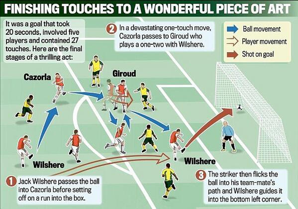 Η Άρσεναλ άνοιξε το σκορ το Σάββατο απέναντι στην Νόριτς με ένα γκολ του Γουίλσιρ, πραγματική αποθέωση της ομαδικότητας. Με αφορμή αυτό το τέρμα, η ιστοσελίδα “101greatgoals” επέλεξε τα 10 καλύτερα ομαδικά γκολ όλων των εποχών.