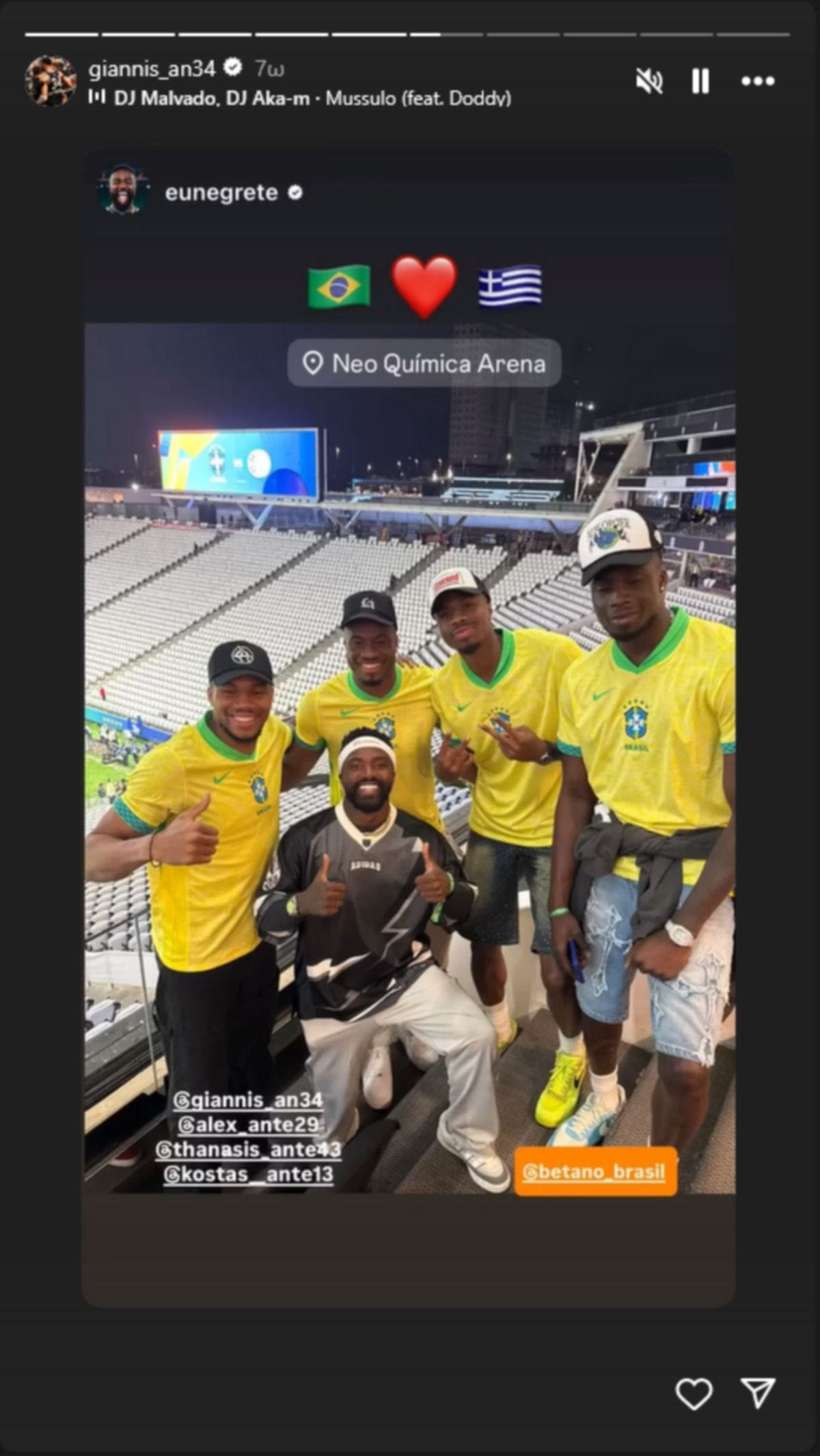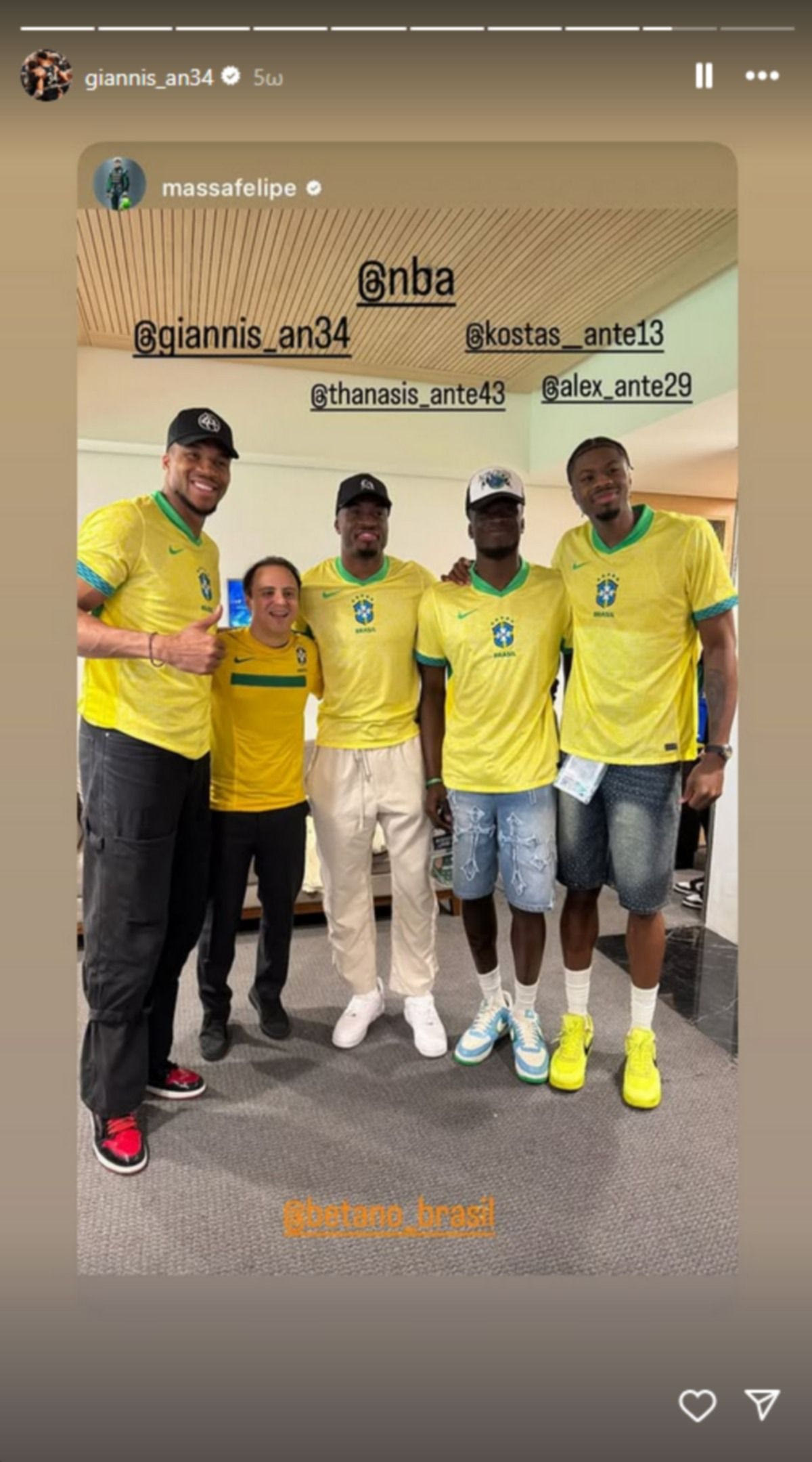 Η εθνική Βραζιλίας είχε μερικούς εκλεκτούς καλεσμένους στην εντός έδρας αναμέτρηση με την Παραγουάη για τα προκριματικά του Μουντιάλ, με τον Γιάννη Αντετοκούνμπο να δηλώνει παρών στην NeoQuimica Arena μαζί με τους Θανάση, Κώστα και Άλεξ και να φορούν όλοι τους φανελες της Σελεσάο.